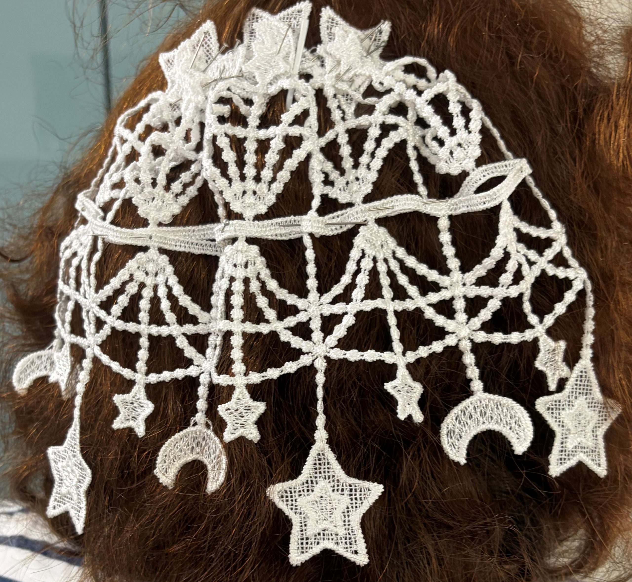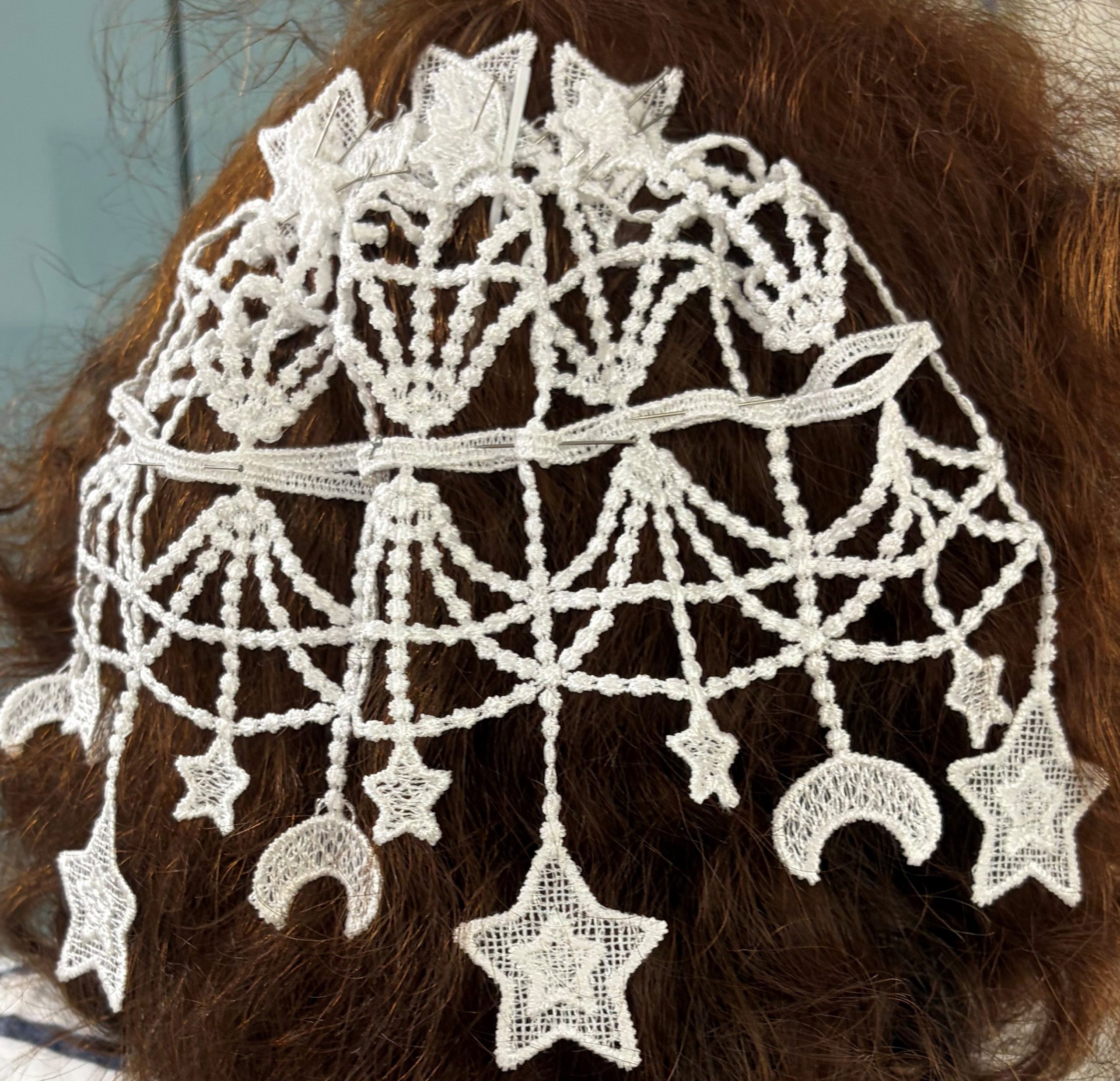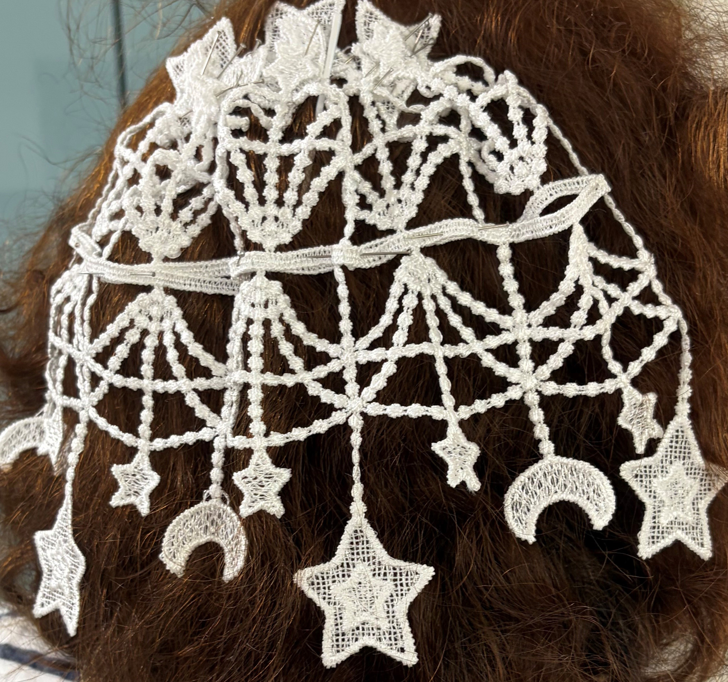 Fancy Dainty Moons & Stars Hand Crafted Synagogue Shul Temple Bridal Tea Party Costume Women’s Victorian Vintage Look Chantilly Lace Doilies Chapel Bridal Head Covering (Weddings Bar Mitzvahs) – Fancy Veil Doilies
